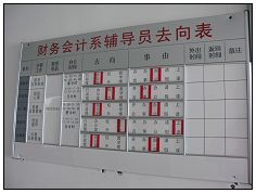 为了加强辅导员队伍建设,增强辅导员工作责任意识,增大辅导员工作的透明度,提高工作效率,避免学生盲目寻找、空等,浪费时间甚至造成误会,从而更好地为学生服务,财务会计系出台辅导员去向表。该表具体分为辅导员姓名、分管工作、联系电话、办公事件、去向、事由、外出时间、返回时间,地点为辅导员办公室门口。