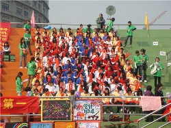 11月4日早晨,伴着微凉的秋风,所有队员统一穿上系服,黄色,橙色,绿色,五彩的着装让人感到无限青春的活力。他们的队形是 “风车”的图案,代表了财务会计系“迎风而上,逆风而动”的勇往直前的精神。另外,啦啦队口号统一,讲求章法,通过鼓点来衬托口号,激发场上运动员斗志。在运动会的这两天里,啦啦队分别用红、黄充气棒作为加油工具,来烘托场上氛围。《阿勒哦》作为财务会计系的加油歌将以最青春的声音飘满整个运动场。