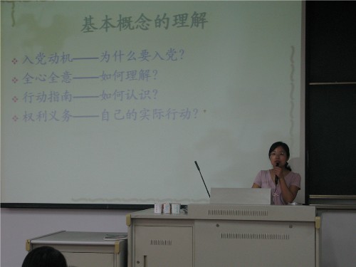 课上,王老师以“如何成为一名优秀的入党积极分子”为题,就党的基本概念的理解展开点评,并对入党动机、党的行动指南、党的权利义务发表自己的见解。当王春青老师提问如何看待社会中的不良现象时,个别同学义愤填膺的发表自己的感想。王春青老师还与同学们探讨“党的专题活动——创先争优”,解释创先争优的重要意义。她还提到,作为先锋模范要做到:平时能看出来,关键时刻能站出来,生死关头能豁出来。用生活实例阐释了党的行动指南,正确定义了全心全意为人民服务的概念。