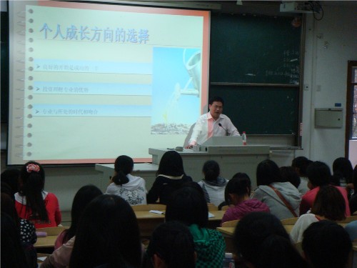 宣讲会伊始,张副总以“千里之行,始于足下,九层之台,起于累土”开始他的演讲,引导同学们掌握投资与理财这个专业概况。此外,他还就个人成长方向的选择、投资理财专业的优势等方面与同学们进行了交流探讨。张副总谈到:“学历是重要的,但更重要的是能耐,用人企业最看重的是实用型人才。”并指出,现在金融业所需人才类型以及理论知识与实践能力的所存在的权重关系。张副总希望同学们在校学习理论知识的同时,也要掌握工作能力,为未来的职业生涯打下一个坚实的基础。之后,张副总对金融业人才需求及职业规划、人生规划等一一进行讲解。他认为人才要具备专业性,知识和技能,要在实践中不断创新,积极参与社会实践。张副总还以自己的人生经历与同学们共勉,说到做人无外乎“中庸”二字,即“无依傍的自立”。