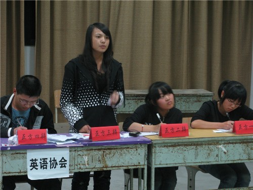 在主持人陈益同学介绍了双方辩论团队和选手之后,比赛正式开始。首先由双方一辩用一分半钟的时间进行观点陈述。接着是二、三辩一对一的攻辩。接下来是最精彩的8分钟自由辩论阶段,双方选手在紧扣自身辩题的前提下不断给对方选手投去无形的炮弹,把比赛推向了高潮。最后由双方四辩进行总结陈词。