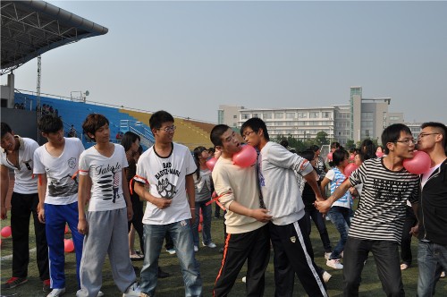 此次活动以团结、友谊、合作为主题,以班级为单位,每班派10名同学参加,共12个代表队。下午2时,活动正式开始。在主持人的带领下,每个队员喊出自己队响亮的口号:“会计一班,非同一班”“会5会5,永远飞舞” …同学们个个斗志昂扬,势如破竹。在第一个环节牵手速递的哨声响起之后,同学们手牵手用自己的身体传气球,现场热闹非常。在快乐向前冲环节中,10名队员以两人三足的形式排成一排,在跑到对面红线处之后,想办法迅速跑回起点,在拉拉队员的鼓劲下大家先后到达了终点。最后一个环节齐心协力站起来,10名队员手挽手背对背坐在地上围成一圈,在裁判的一声令下,每队同学迅速起身。场外同学高声欢呼,将气氛推向高潮。