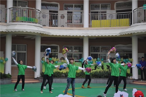 开幕式上,幼儿园的孩子们带来了精彩的轮滑、自行车方阵、滑板先锋等表演,接着,各位领导进行发言,对小朋友们的运动会表示支持和鼓励。随后社区的奶奶们进行腰鼓表演,老师跳了一段活泼有趣的竹竿舞,我系健美操队员也献上了充满青春活力的啦啦操,她们穿着绿色的系服衬着亮白的T恤显得他们格外精神,五色的彩球挥动在苍穹下,健美操队员们和着欢快的乐符尽情摇摆跳动。