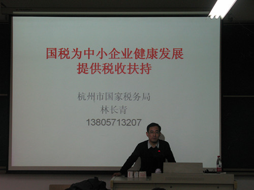 讲座以“国税为中小企业健康发展提供税收扶持”为中心,着重介绍了税之三重——基本知识、基本政策以及基本技能。在提到基本政策时,围绕落实增值税优惠政策、用足用好企业所得税优惠政策进行阐述,落实固定资产进项税额抵扣政策等方案、落实小型微利企业所得税优惠政策、落实鼓励企业创业投资的所得税政策和用反避税的例子来说明落实降低企业重组成本的所得税政策等。讲座过程中林长青先生用生动的例子进行讲解,现场气氛活跃,在场的老师和同学们对税务知识有更深刻的了解和认识。