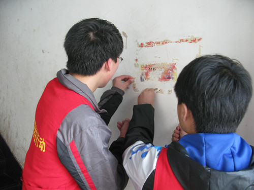 为积极响应我系“倡响春之声,践行公益路”学习雷锋主题月活动,2012年3月14日下午,经贸财务会计系青年志愿者协会的26位部门成员在成蹊苑开展了以“清除楼层小广告,还舒适生活新面容”的志愿服务活动。