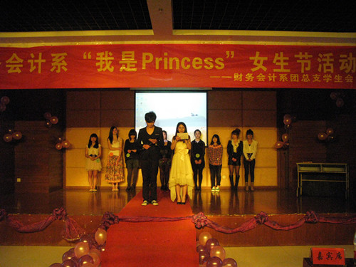 2012年3月27日下午6点,财务会计系女生节系列活动——“我是Princess”在我校学生活动中心隆重举行。院学生处胡小爱老师、财务会计系团总支副书记夏欢老师、财务会计系辅导员张译尹老师、院学生会主席邵辉、财务会计系团总支副书记兼学生会主席黄永煌、国际贸易系团总支副书记兼学生会主席郭丽娜、人文旅游系学生会主席张湘、应用工程系学生会主席杨莹莹、工商管理系学生会主席王杰、信息技术系学生会主席何宝雄、院女生部部长谢玲璐担任本次活动的嘉宾评委。
