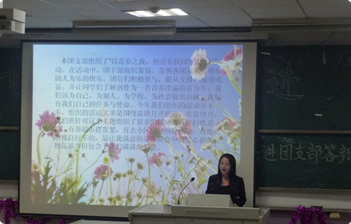 2012年4月15日晚上六点三十分,在1号教学楼101教室举行了“飞扬青春,争创先进”财务会计系先进团总支答辩会。参加本次答辩会的评委有:财务会计系总辅导员夏欢老师,辅导员张译尹老师和我系团学各部长。