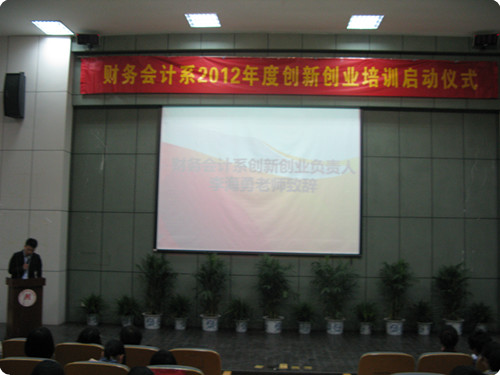 为强化大学生创新创业意识,激发大学生创新创业潜能。2012年4月15日晚上6点,财务会计系2012年度创新创业启动仪式在图书馆报告厅举行。我系大一年级各班同学参加了此次仪式,团总支副书记夏欢老师、辅导员李海勇老师和张译尹老师出席了此次仪式。