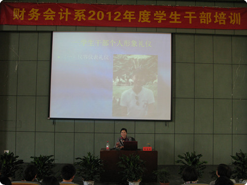 为提高学生干部的形象和素质,更好地增强学生干部的人际交往能力,2012年4月17日下午两点半在我院图书馆报告厅,我系特邀请人文旅游系胡爱娟教授为我系学生干部开展题为“学生干部形象塑造与社交礼仪”的讲座,团总支副书记夏欢老师出席本次讲座,团学各部门部长和成员以及班级干部代表与会。