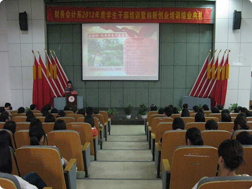2012年6月19日下午三点于图书馆报告厅隆重举行财务会计系2012年度学生干部培训暨创新创业培训结业典礼。财务会计系系主任潘上永教授、系党总支副书记王春青老师、副主任李国辉老师、系总辅导员夏欢老师、系辅导员金莉莉老师、李海勇老师、张译尹老师出席,所有结业成员与会参加。