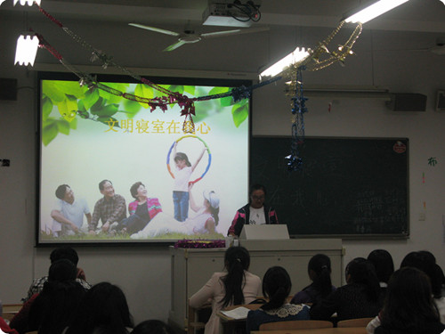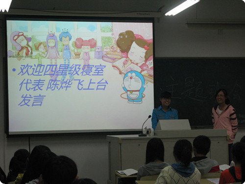 每个班以自己独特的方式开展本次班会,有些班级向同学们介绍了文明寝室活动的细则,观看了文明寝室有关的视频;有些班级组织四星级寝室代表上台演讲,将建设四星寝室的经验与大家分享。