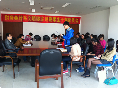2012年11月5日中午12时,财务会计系于图书馆八楼会议室开展了关于文明寝室建设的会议。出席本次会议的嘉宾有系总辅导员夏欢老师、辅导员周全老师、张译尹老师、陈琴老师,学生会副主席邵锋、团学各部门部长、大一大二的班长以及学习委员与会参加。