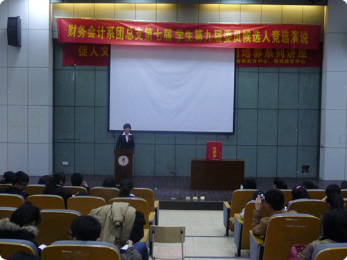 2012年11月20日晚,财务会计系团总支第七届、学生第九届委员候选人竞选演说在图书馆报告厅举行。出席此次演讲的嘉宾有财务会计系团总支副书记兼总辅导员夏欢老师,学生党支部书记辅导员陈琴老师,辅导员张译尹和周全老师,团总支第七届学生第九届委员候选人及部分学生代表。