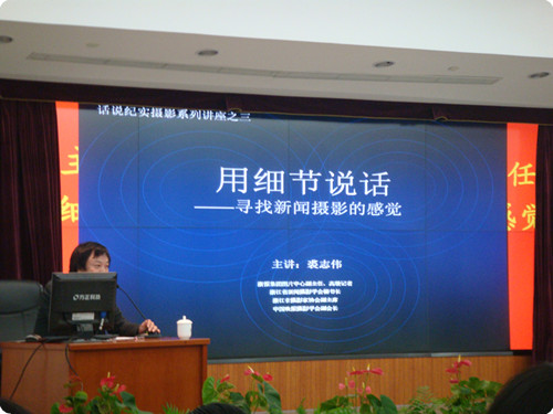 裘志伟主席表示此次讲座主要是为了与下沙的摄影爱好者交流和分享他从事记者工作多年以来的心得和经验。裘副主席强调摄影比拼的是文化,照片拍得其实是摄影者自己的思想。摄影的题材是否有新意,细节是否丝丝入扣是摄影文化的关键。照片所要传递的思想是靠摄影者自己去发现和欣赏的,“发现”是一种能力,是思想文化的积淀。学会“欣赏”更是必修的基本功之一,只有学会欣赏才能从别人的作品中获得经验。随后,裘志伟主席以“图片是用细节说话”向在场观众展示了一系列优秀的获奖作品。观察是拍出好照片的核心,只有注重细节,它才会传递丰富的信息,让你真正融入生活。而有细节必有故事,有故事才能打动人,因此拍出有故事的好照片并不困难。