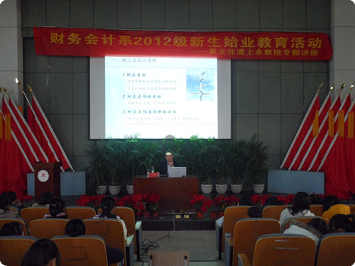 2012年12月5日下午14时50分,财务会计系主任潘上永教授在图书馆报告厅为2012级大一新生开展了始业教育活动的专题讲座,财务会计系团总支副书记夏欢老师、辅导员张译尹老师聆听了本次讲座。