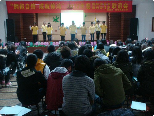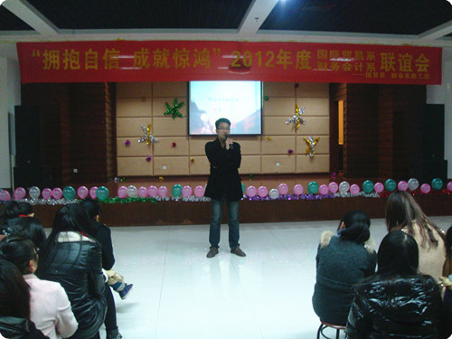 2012年12月3日晚上六时,我系与国贸系合办的“拥抱自信,成就惊鸿”2012年度财务会计系、国际贸易系贫困生联谊会在学院学生活动中心举行。出席此次联谊会的有财务会计系辅导员周全老师,国贸系辅导员章荣老师,院勤工部部长陈娇娇,国贸系勤工部部长孙健,我系助管部部长金晓静,两系大一贫困生作为观众观看了本次晚会。