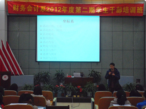 2012年12月25日下午2点40分,人文旅游系胡栋老师在学院图书馆报告厅为我系学生干部开展以“活动策划方法分享”为主题的讲座。我系团总支副书记兼总辅导员夏欢老师主持,我系团学干部及大一各班班委聆听本次讲座。