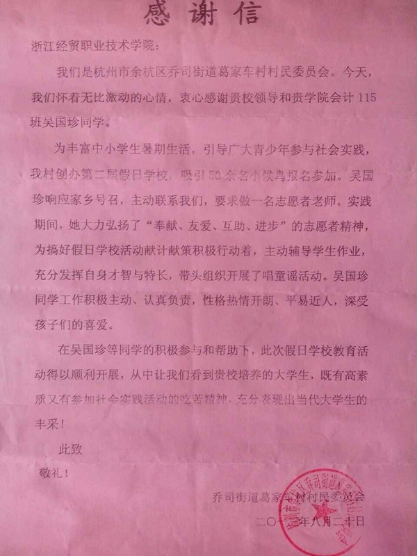 ,我系收到一封来自杭州余杭区乔司街道葛家村委寄来的一封感谢信。该社区为丰富中小学生暑假生活,引导广大青少年参与社会实践,故创办了第二届假日学校。我系财务会计系会计115班吴国珍同学主动联系,积极参与,成为了其一名志愿者老师。