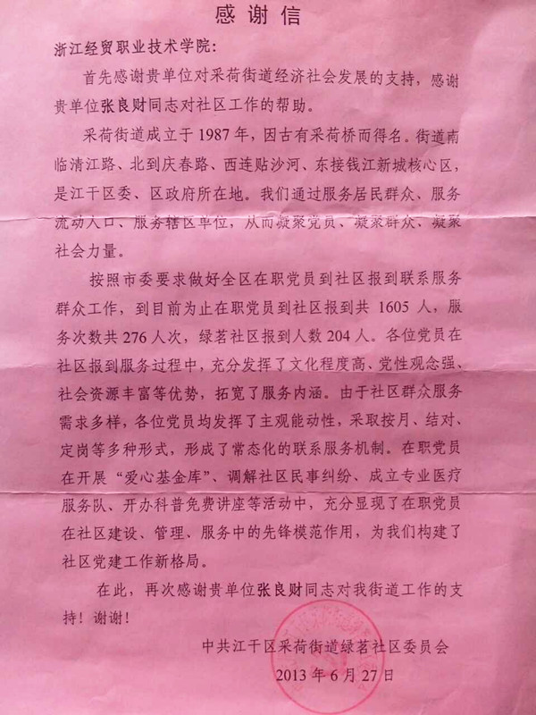 【感谢信】江干区采荷街道绿茗社区委员会致我系教师张良财的一封感谢信