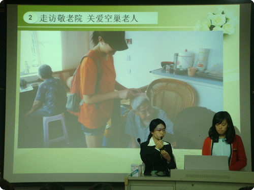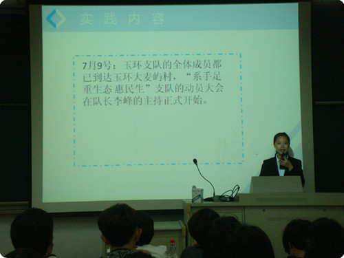 6位学生代表分别汇报了团队和个人分散社会实践的筹备过程和开展情况,各代表所做的成果汇报生动形象。“敬老人,忆革命,梦中国”赴温州鹿城支队黄丽丽同学介绍了目前空巢老人的现状,并鼓励大家多陪伴老人,让空巢老人感受到更多的爱心和温暖。