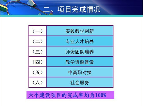 潘上永老师做了精彩的20分钟总体工作汇报,分别从实践教学创新、专业人才培养、师资团队培养、教学资源建设、中高职对接、社会服务等六方面介绍项目完成情况。重点介绍项目建设成效,经过两年建设期,形成了两个特色:一是开设“跨专业综合实训”课程,创造了新的教与学方式;二是开展“业务引进校园”实习模式,解决了会计专业集中实习难题。提升了专业服务产业发展的能力,提高了人才培养质量,专业辐射范围由校内至省内再到全国。