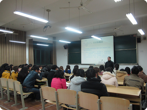 2013年12月16日下午6:00整,我系有幸邀请到了院学生处副处长金初冬老师,为我系学生干部开展以“学生干部语言表达”为主题的专题讲座,系总辅导员夏欢老师聆听了此次讲座。