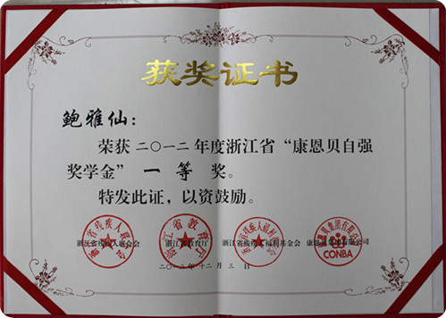 鲍雅仙同学,来自我系税务111班,听力二级残疾,她荣获2012年度(2012-2013学年)浙江省“康恩贝”自强奖学金一等奖!