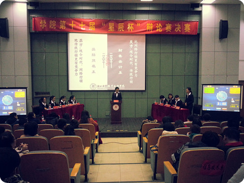 2013年12月16日下午4点,在图书馆报告厅举行了浙江经贸职业技术学院第十七届“星辰杯”辩论赛决赛。本次辩论赛的评委有学院学生处副处长潘丽萍老师,院学生处团委副书记胡小爱老师,人文旅游系副主任谢芳老师,金融院辩论队队长贾祥雪以及中国计量学院院辩论队队长董武德。