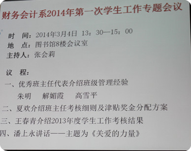 2014年3月4日下午,财务会计系举行了2014年度第一次学生工作会议,会议由系副主任张会莉老师主持,系主任潘上永教授及财务会计系全体教师出席了会议。