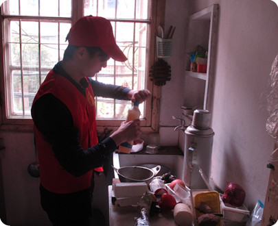 黎园社区91岁的孤寡老人徐爷爷是一个“潮人”,平时喜欢聊qq,刷微信。当天下午,碰巧网络出了故障,徐爷爷一筹莫展。志愿者们立刻咨询电信相关人员,尝试解决网络故障,因为徐爷爷家无电脑,暂时处理不了,于是志愿者与其约定本周四晚上带着电脑帮他重置密码。此外,志愿者们还帮徐爷爷打扫卫生、刷碗,陪他听戏曲,徐爷爷则拿出甘甜的橘给志愿者们品尝。志愿者与徐爷爷促膝而谈,其乐融融。