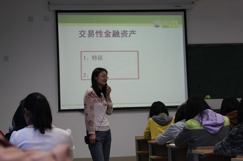 吴燕老师为该校财会金融系的师生开展公开课教学,讲授《财务会计实务》课程的交易性金融资产章节。前后90分钟的课堂教学,吴燕老师由浅入深,不断激发学生课堂热情,以引人入胜的案例故事,精美的PPT课件,把整堂课上的精彩纷呈,赢得了热烈的掌声,充分展示了我院教师风采。