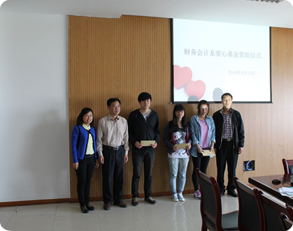 4月15日,财务会计系在系会议室举行了简短的爱心基金资助仪式。学院卢显林副院长、财务会计系潘上永主任、总支副书记王春青老师、全体辅导员老师和相关班主任参加了资助仪式。刘**等3位学生每人接受了1000元的资助。这笔资助虽然不能完全解决学生的经济困难,但是却传递了学院和系部对他们的关心关爱之情。