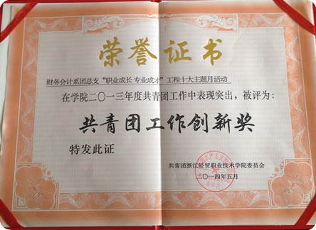 在本年度的五四表彰中,财务会计系团总支“职业成长 专业成才”工程十大主题月活动被评为“共青团工作创新奖”;会计123团支部获“五四红旗团支部”称号, 投资理财122团支部获得“先进团支部”称号;会计121班叶晨蕾荣获“十佳团干部”称号;罗晓等80名同学和钱少琴等41名同学荣获“优秀团员”、“优秀团干”称号;陈雅红等3名同学获得“宣传工作先进个人”称号。心舞手语协会荣获“优秀社团”称号。