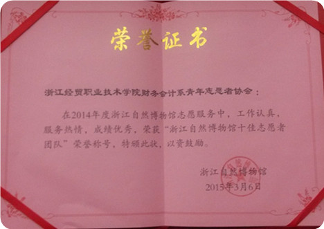 我系志愿者团队荣获“浙江自然博物馆十佳志愿者团队”的称号。今后我系志愿者将继续发扬“奉献、友爱、互助、进步”的志愿精神,以更积极、更热情的态度地去服务游客。
