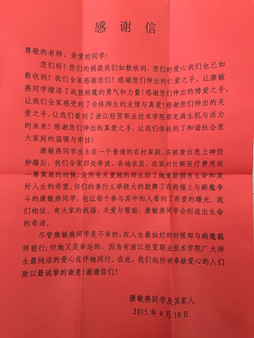 当得知这个不幸的消息,我系向全院师生发出爱心捐款的倡议。一时间,全院师生都投入到了这场充满爱意的活动中。捐款不分多少,善举不分先后,贵在付出爱心。我系党员教师带头捐款,纷纷踊跃奉献爱心,希望靠自己的微博之力,能帮助到康敏燕同学,此外,我院应用工程系为了能够帮助康敏燕同学,将先前志愿义卖活动中所筹集的750元善款全数捐出;工商管理系为此特别开展爱心义卖活动,将义卖所得130元全额捐献给康敏燕同学,我系青年志愿者协会以部门名义捐献善款200元,还有更多不知名的同学将自己平时的零花钱、打工攒下的钱都省下来默默捐出,这样的感人事例举不胜举......截止2015年4月14日,在全院师生的共同努力之下,共筹集31720元善款,并已送至康敏燕爸爸手中。4月17日,康敏燕爸爸和康敏燕的姐夫特地赶到学校,送来他们一家的感谢信。在此系部代表康敏燕同学和她的家人,向所有帮助过她的老师和同学们致以最真挚的谢意!