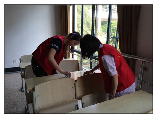 3月份,我系青年志愿者协会首次开展清理课桌活动,得到了老师、学生的一致好评。4月28日下午我系学生志愿者再次来到教学楼开展清理课桌活动。