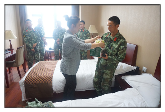 教官们对老师和同学的到来表示热烈的欢迎。朱颖老师与教官们进行亲切的交谈,感谢教官一直以来的辛勤付出,让同学们在军训中得到锻炼收获成长,为迎接全新的大学生活打下良好基础。对此,教官们高度赞扬了我系2015级新生在军训中所表现的不怕苦不怕累的优秀品质,对院系领导持续以来的关心和支持表示感谢,教官们充满信心地表示,保证高质量、高标准完成学校的军训任务。此外,同行的老师、同学还将特别准备的牛奶和新鲜水果递送给教官们,向教官送上诚挚的中秋节日问候,表达真诚的感谢之情。