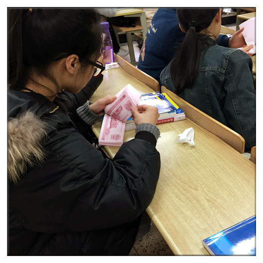 每天早上,走过我系的早自习教室,都能听见“哗哗”的点钞声。大家都在专心致志地进行练习,先把点钞券封条拆掉,然后把钞劵在桌面上墩齐、打开成扇形,使它形成坡度、便于捻动,“5、10、15”同学们嘴里默念、心里默数……尽管很多同学练习点钞的时间不长,但有些已经能够熟练地掌握单指多张点钞法、多指多张点钞法、扇面式点钞法等技巧,还能打出漂亮的扇形弧度,技法娴熟。
