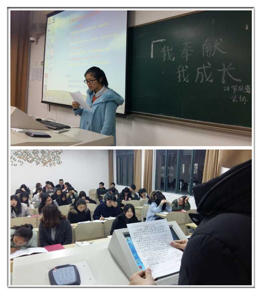 2016年3月6日晚上6点30分我系于大一各班晚自习教室组织开展了主题为“我奉献,我成长”的三分钟演讲活动。