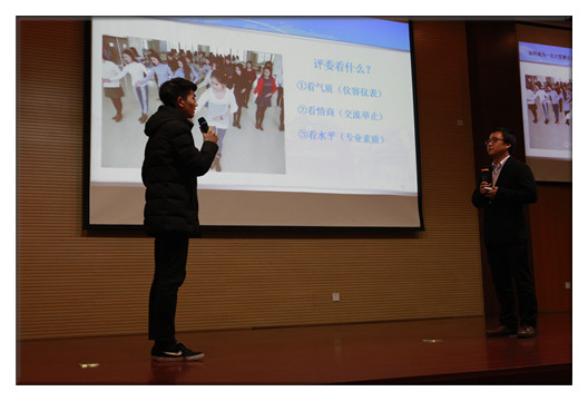 陈书记以在第二届世界互联网大会中接待“习大大”、梅德韦杰夫等国家领导人的具体实例、实用的经验分享、亲切的互动交流向大家娓娓道来,要成为一位“高大上的志愿者”就要不断培训演练、主动成长学习,就要“讲纪律”“讲完美”“讲大局”“讲方法”,这些都使在场的同学受益匪浅。陈书记还与同学们进行了“志愿者面试”环节的互动,请同学们分别上台用中、英文现场模拟志愿者的面试情况,“请一分钟自我介绍”、“通过参加互联网大会志愿服务,你想获得什么”、“What’s your hobby”、“Can you sing an English song”,互动中,有的同学介绍了自己想当志愿者的初衷、有的同学现场唱起了英文歌,精彩的互动引得场下观众阵阵掌声。