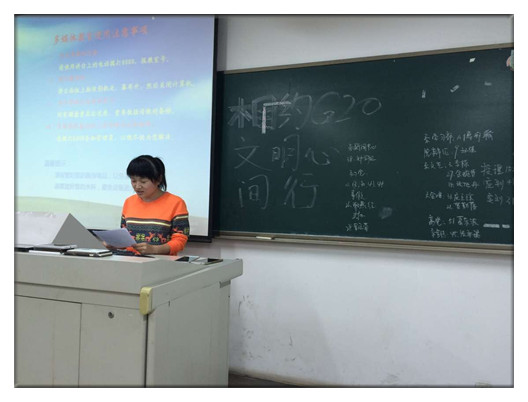 为了迎接“G20”的到来,2016年4月10日,我系大一各班晚自习开展了以“相约G20,文明心间行”为主题的三分钟演讲。从同学们认真细致的准备、热情洋溢的演讲中不仅可以看出大家身为杭城学子的骄傲和对“G20”的期盼,也可以看出大家正以实际行动投身其中。