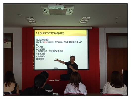 熊老师从四个方面讲述了校园活动策划书写作培训的要领,即活动策划书的概述、准备、内容构成以及编制要求。他建议大家针对当前的状况,考虑可操作性、兼容性,并能有一定的创新性,细查、多思,写明六大构成内容,完成一篇实用的活动策划书。对此,同学们纷纷赞同、认真记录。最后熊老师以曾经为帮助流浪小动物而举办的拍卖会等一系列校园活动为实例,向大家展示了一份高质量的策划书在活动中的重要作用。