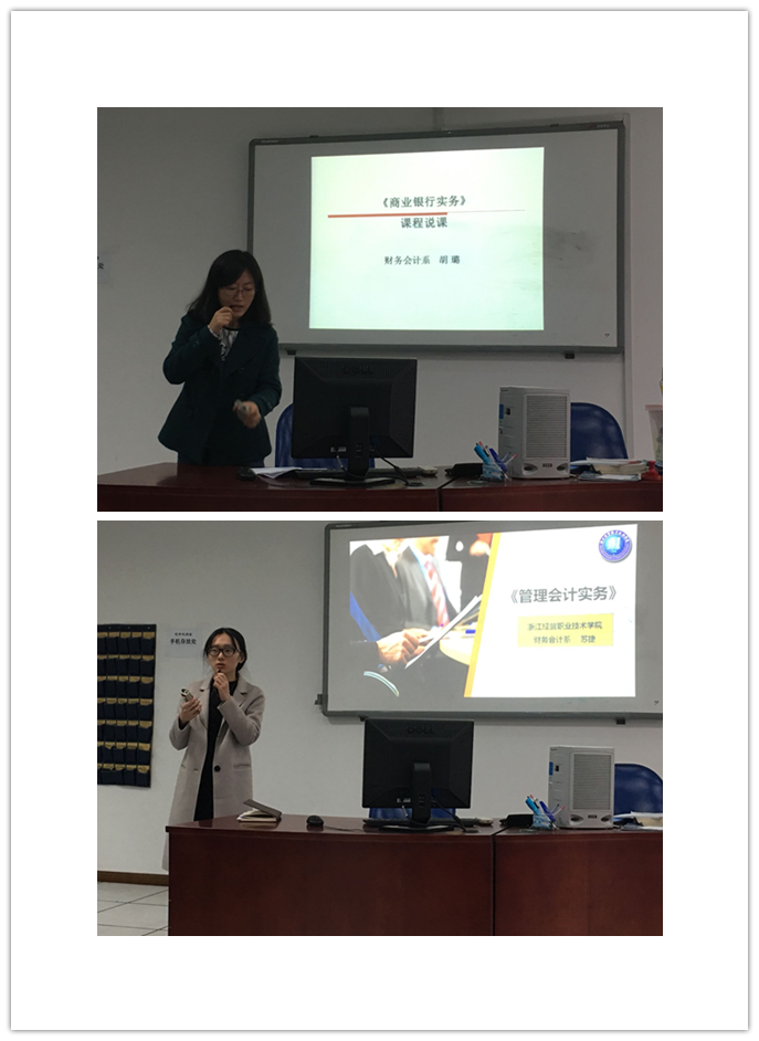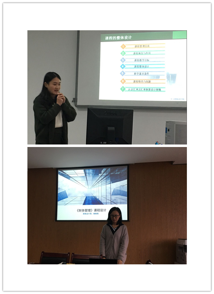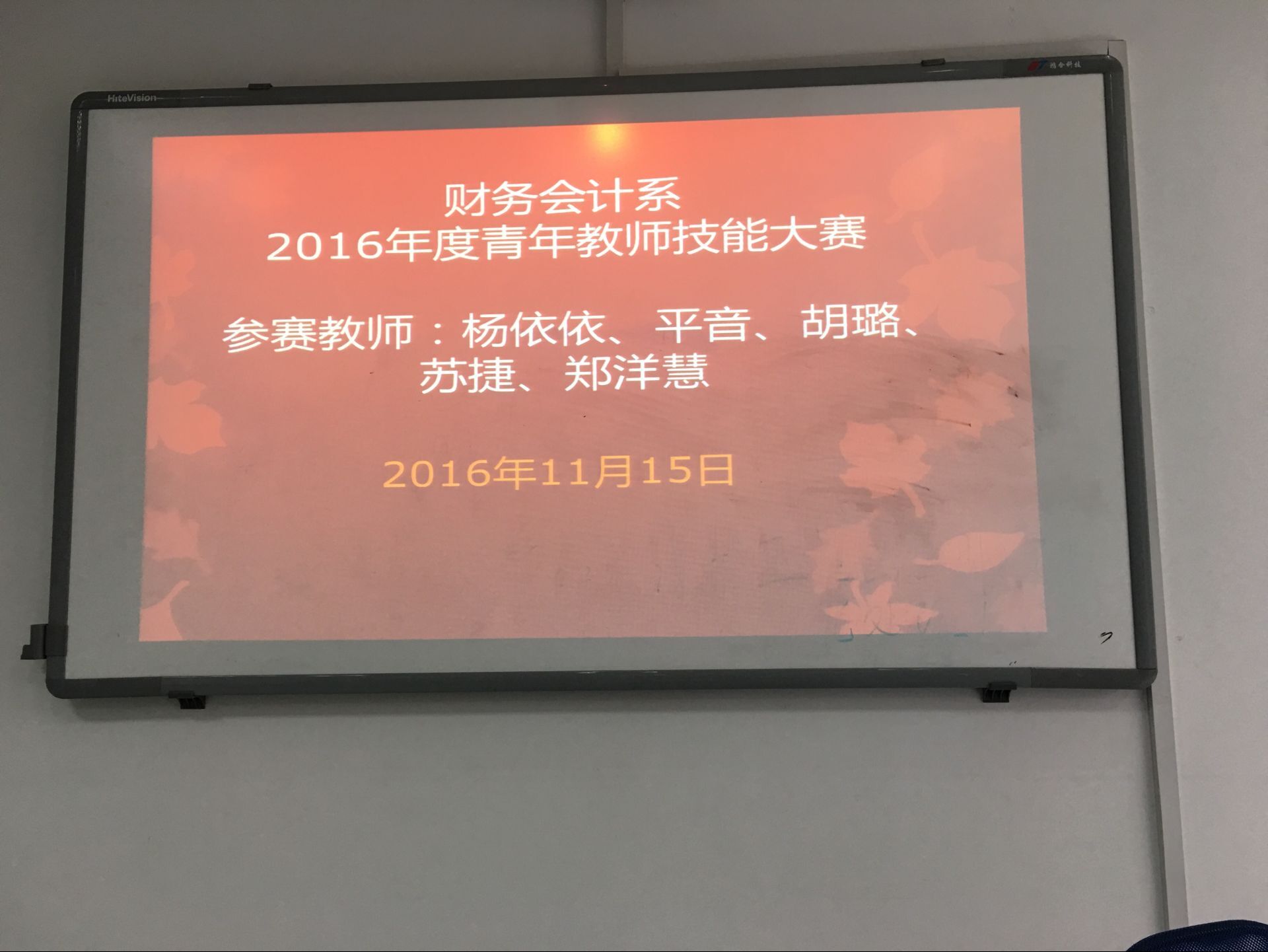 2016年11月15日,财务会计系举行了2016年度青年教师技能大赛。杨依依、平音、胡璐、郑洋慧、苏捷五位专业老师参加比赛,系主任潘上永、副书记朱颖、副主任张会莉、冯江涛以及财会系全体教师到场听取了五位老师的说课。
