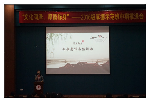 在观看完推进会后,系党总支副书记朱颖老师为大会作总结,她在发言中提到,她被同学们人人参与“日行一善”的氛围深深感动,“互联网+公益”的形式更是让厚德示范班在上一届的基础上有了更多的传承和创新。