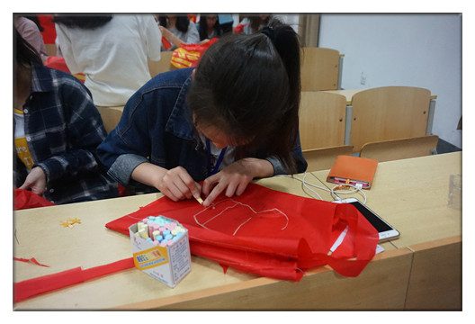 活动中共70位同学将废旧横幅作为环保袋制作的材料,大家在一开始就充分展示了自己熟练的“手指功夫”,剪裁、穿针、缝合,在一双双巧手下,一只只环保袋初具模型。同学们还充分发挥自己的奇思妙想对“横幅环保袋”进行装饰,有用彩色的线绣出字母图案,有用彩色粉笔在环保袋上画出图形,还有的用剪刀为环保袋剪除流苏。
