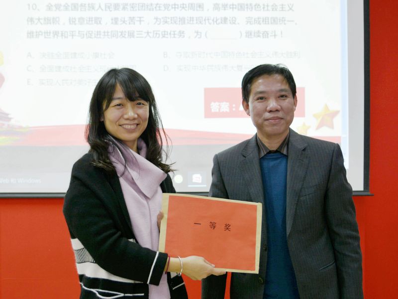 党课后,为巩固学习效果、丰富学习形式,系党总支开展了“十九大的知识竞赛”。知识竞赛以各支部为单位,题目包括十九大召开的主题、这五年来取得的成就、社会主义的本质等。比赛中,党员同志们个个认真参与、积极抢答、踊跃回答,最终,会计党支部表现突出,取得了团体一等奖。