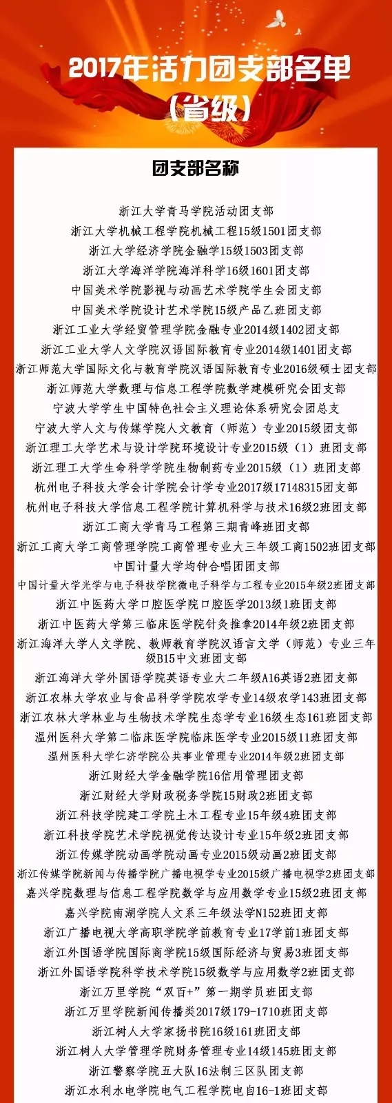 为贯彻落实高校共青团改革有关精神,深入实施高校基层团支部“活力提升”工程,团省委学校部于10月开展了2017年度浙江省高校共青团“活力团支部”创建遴选活动。经院(系)、校、省层层遴选,最终产生100个省级“活力团支部”,现将具体名单公布如下: