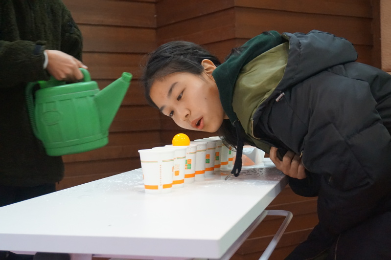 决赛共有三轮游戏组成,三轮累计完成的最快最好的寝室获胜。各个寝室派出得力“干将”,在“吹乒乓球”中,大家用嘴将乒乓球吹过桌子上连着摆放的八个盛满水的杯子;