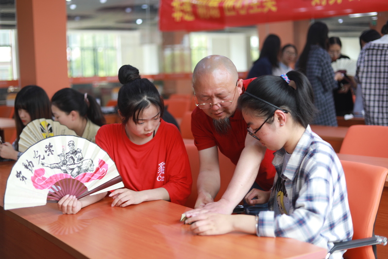 “制作一把纯手工扇需要108道工序,光是制作周期就需要一周以上,扇骨和扇面的装配是一道细致活,前前后后加起来大概要50道工序。”张北兴大师边说边演示,他把扇面平铺于案桌,均匀捻开细骨,小心将细骨逐根插入。在大师的指导下,同学们也动起手来,把扇面折叠再铺开,将扇骨对准又轻推,直到两者齐齐整整、严丝合缝为止,再用胶水黏上,这个过程极大地考验了大家的手艺和耐心。最终,经历了三个多小时的摸索和实践,30多把折扇大功告成。随后,大家展开了丰富的想象,为自己亲手粘合的扇面画上各种图案、写下“五一劳动节”、“劳动最光荣”的字样。