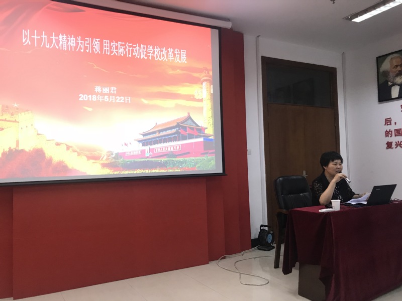 蒋丽君副校长围绕“如何学懂弄通十九大精神和习近平新时代中国特色社会主义思想、如何在学懂弄通的基础上深入贯彻实践十九大精神和习近平新时代中国特色社会主义思想”两个问题进行了讲解。她指出,学懂弄通十九大精神和习近平新时代中国特色社会主义思想,是我们当前的首要政治任务,我们必须高举习近平新时代中国特色社会主义思想伟大旗帜,把党的十九大精神内化于心,外化于行。要在“学懂”上下功夫,原原本本学,要在“弄通”上悟真谛,深入系统学,要在做实上见行动,踏踏实实做。